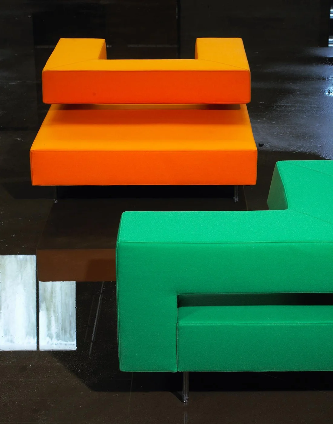 In this design, the relationship between the backrest and the seat is established through armrests that extend from the backrest itself. This connection plays a key role in shaping the overall form and in the arrangement of the modules.